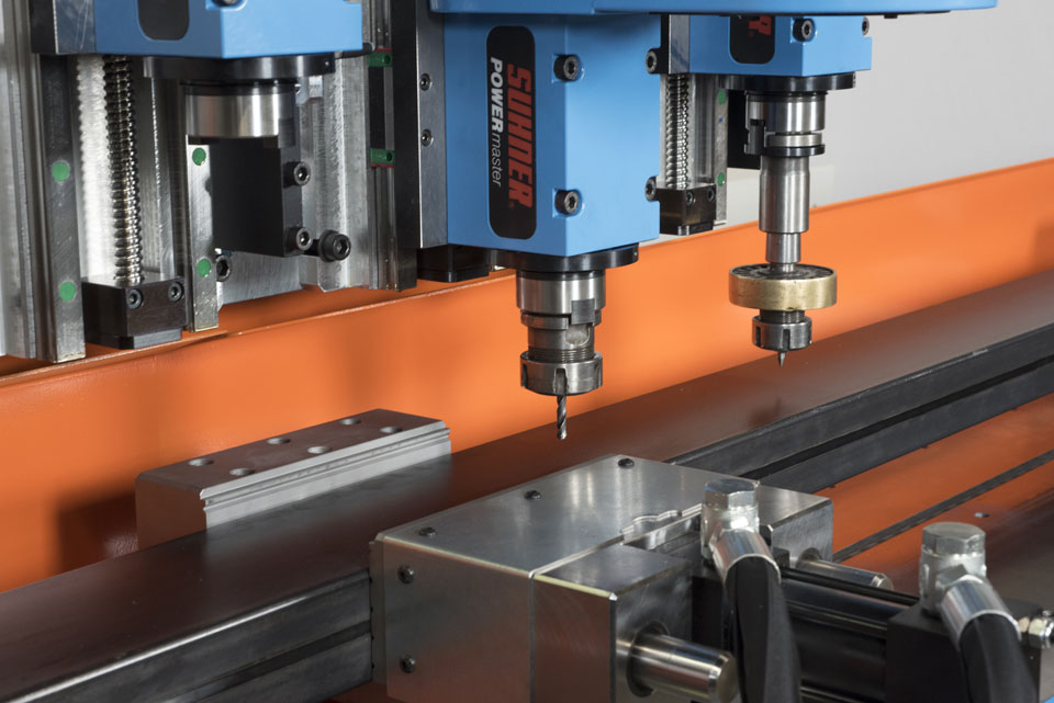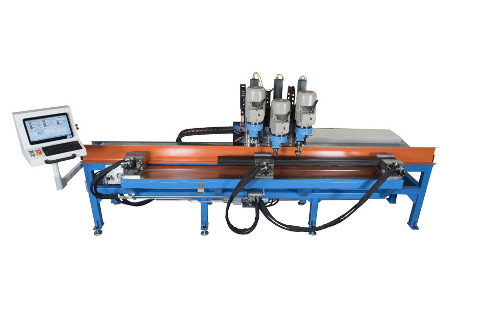 Macchina foratrice automatica, completa di N. 3 unità di foratura motorizzate, con il movimento verticale. E’ possibile regolare la parte di corsa eseguita in rapido e quella eseguita in lento.