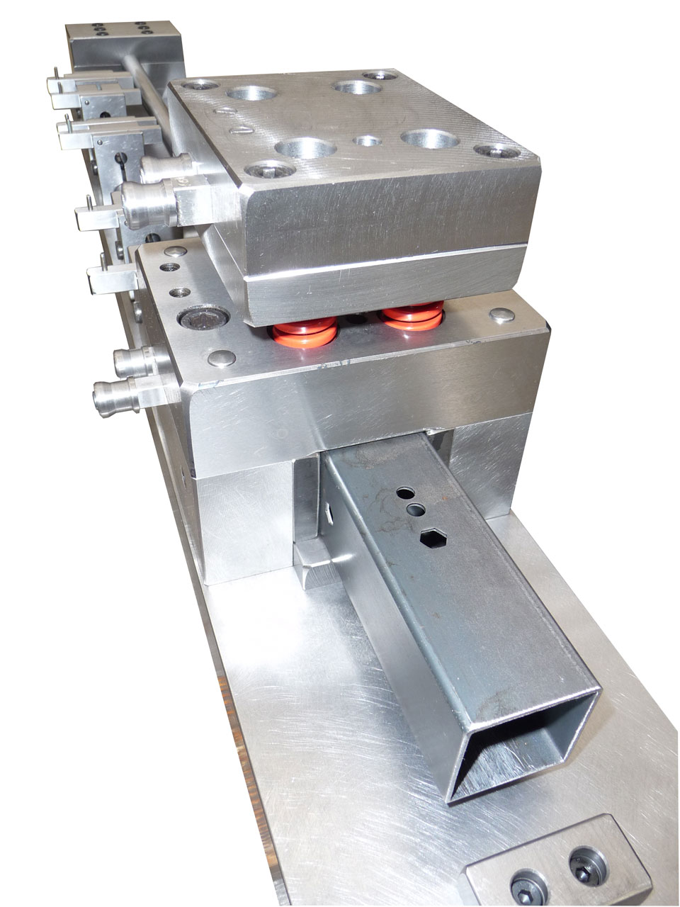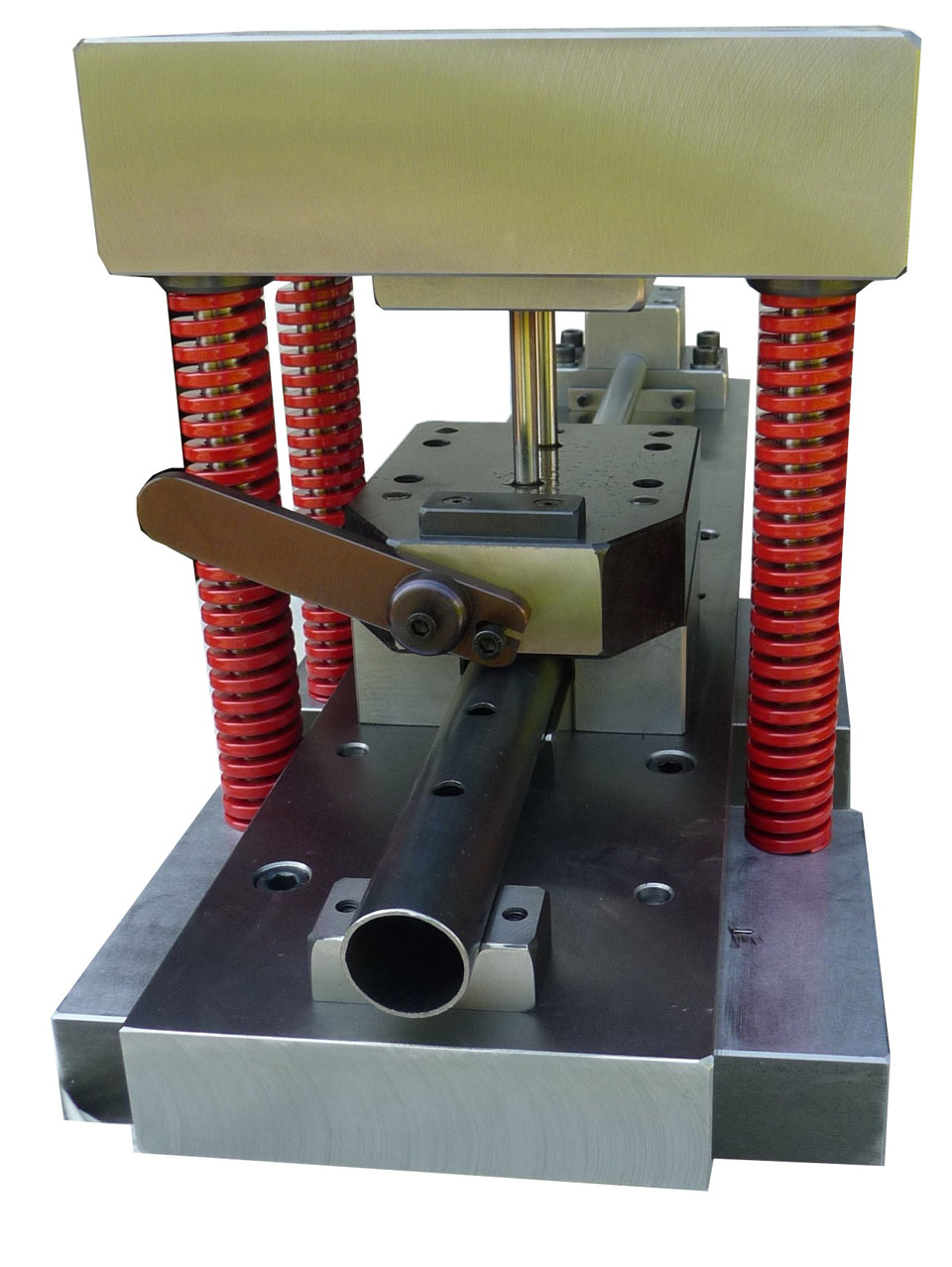 Stampo per la punzonatura dei tubolari, con matrice interna per non deformare il tubo durante la punzonatura. Lo stampo è completo di fermi di battuta regolabili, al fine di impostare la distanza del primo foro dall’inizio del tubolare, e il passo tra i fori. Lo stampo si utilizza con una pressa meccanica o idraulica, e il ritorno del punzone è indipendente dalla mazza battente della pressa.