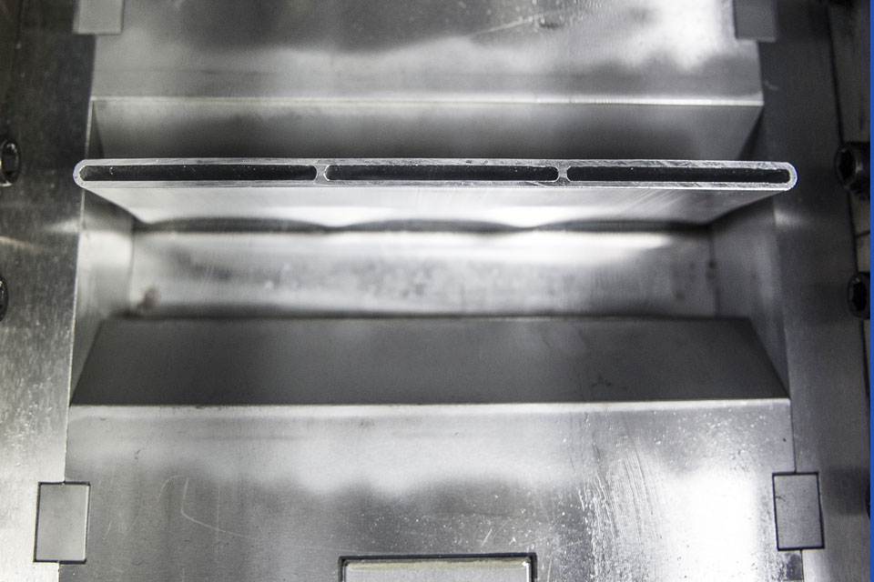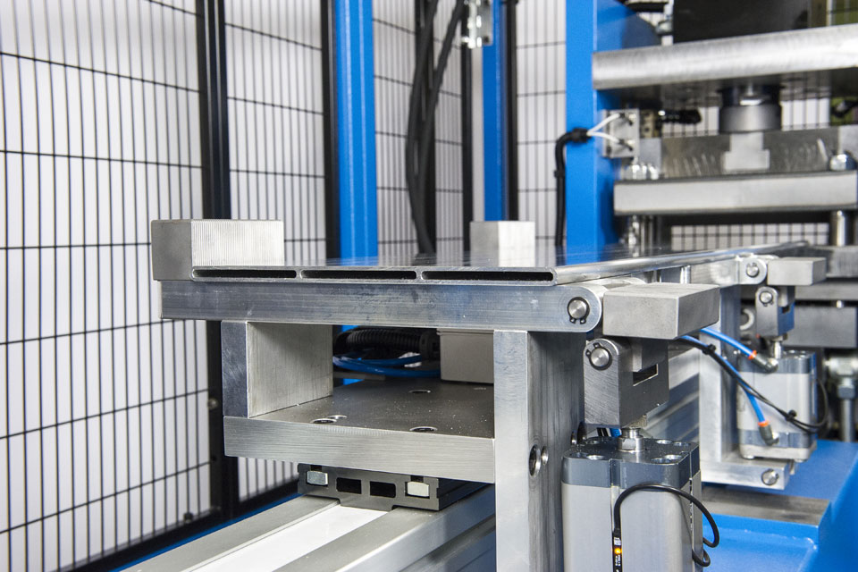 Tramite il funzionamento dei cilindri idraulici l’estruso viene bloccato e successivamente vengono realizzate le pieghe.